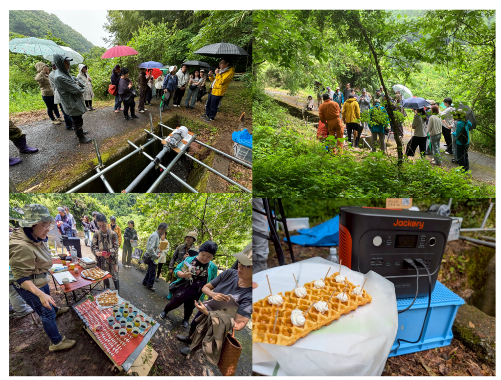 大きな小水力発電所の余水を活用して実験的に設置しているJet水車を見学し、仕組みや取り付け方法を解説します。また、Jet水車で作った電気でワッフルとコーヒーを提供し、森の中のカフェが実現!